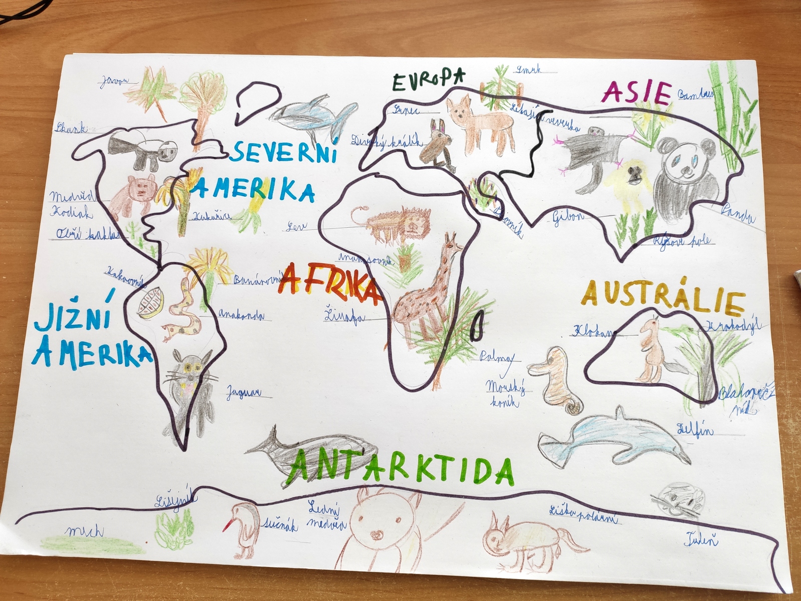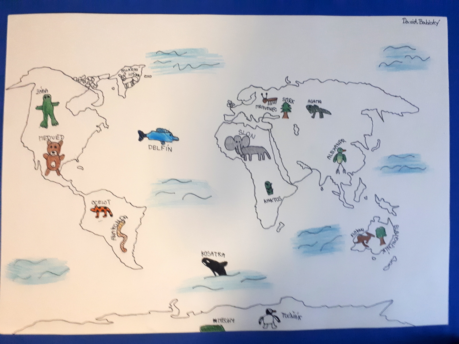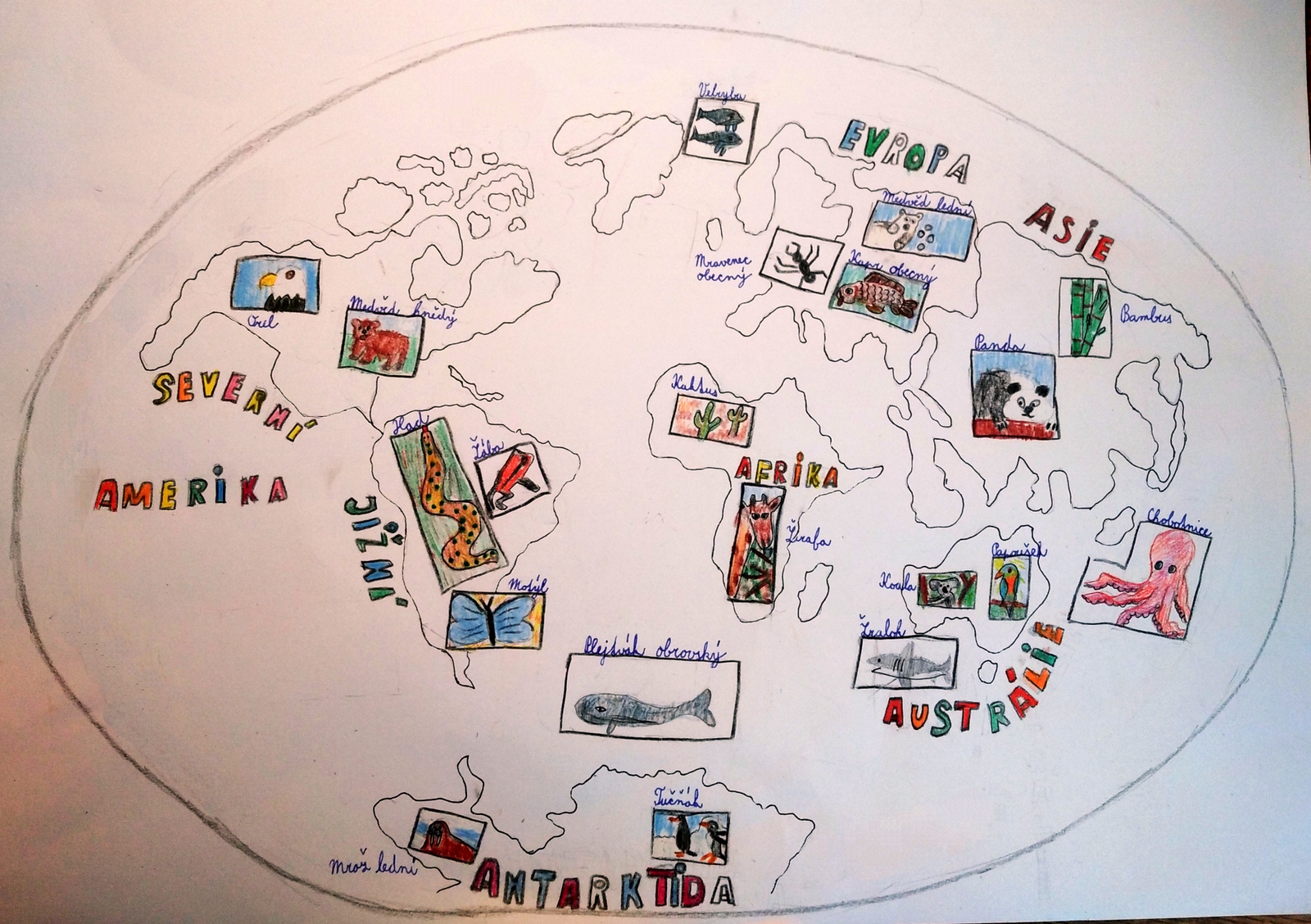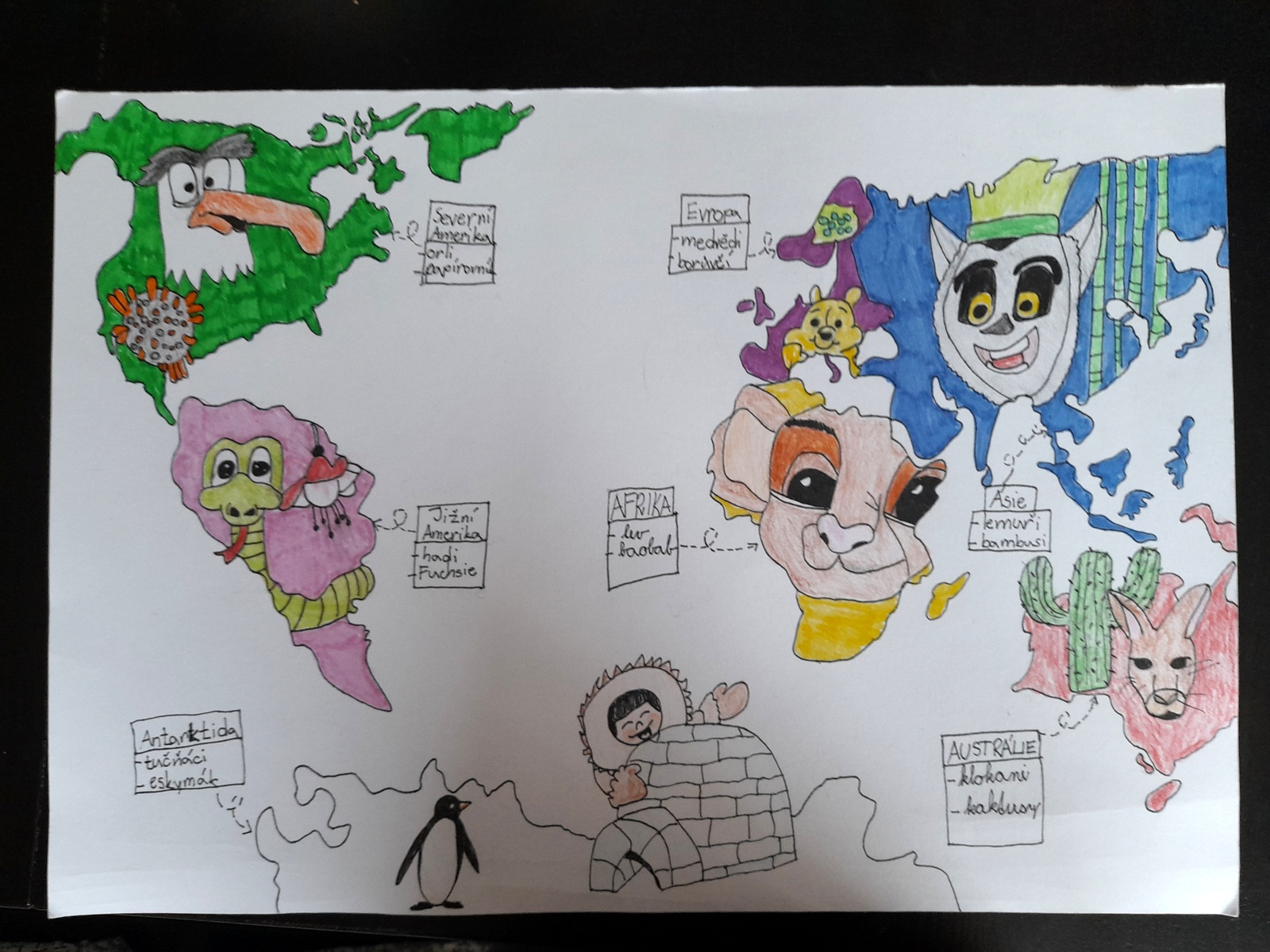 V rámci mezipředmětového propojení žáci 5.C pracovali během distanční výuky na projektu z přírodovědy. Úkolem bylo zakreslit všechny kontinenty, jak jsou rozloženy na Zemi. Do každého kontinentu měli nakreslit 2 zástupce živočichů nebo rostlin typických pro daný kontinent. Jak se jim to povedlo, posuďte sami.