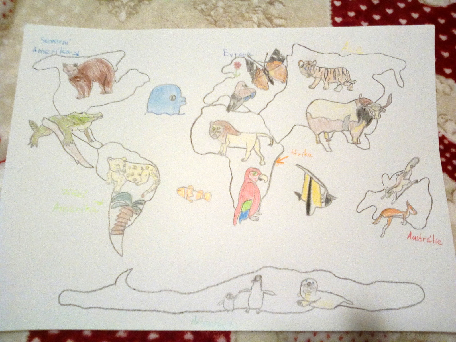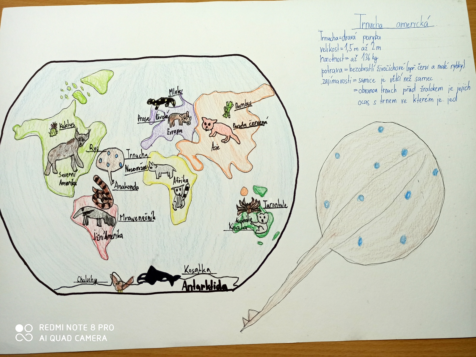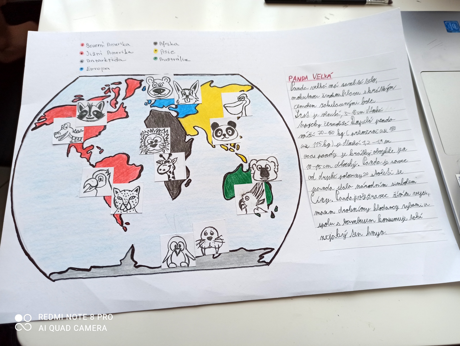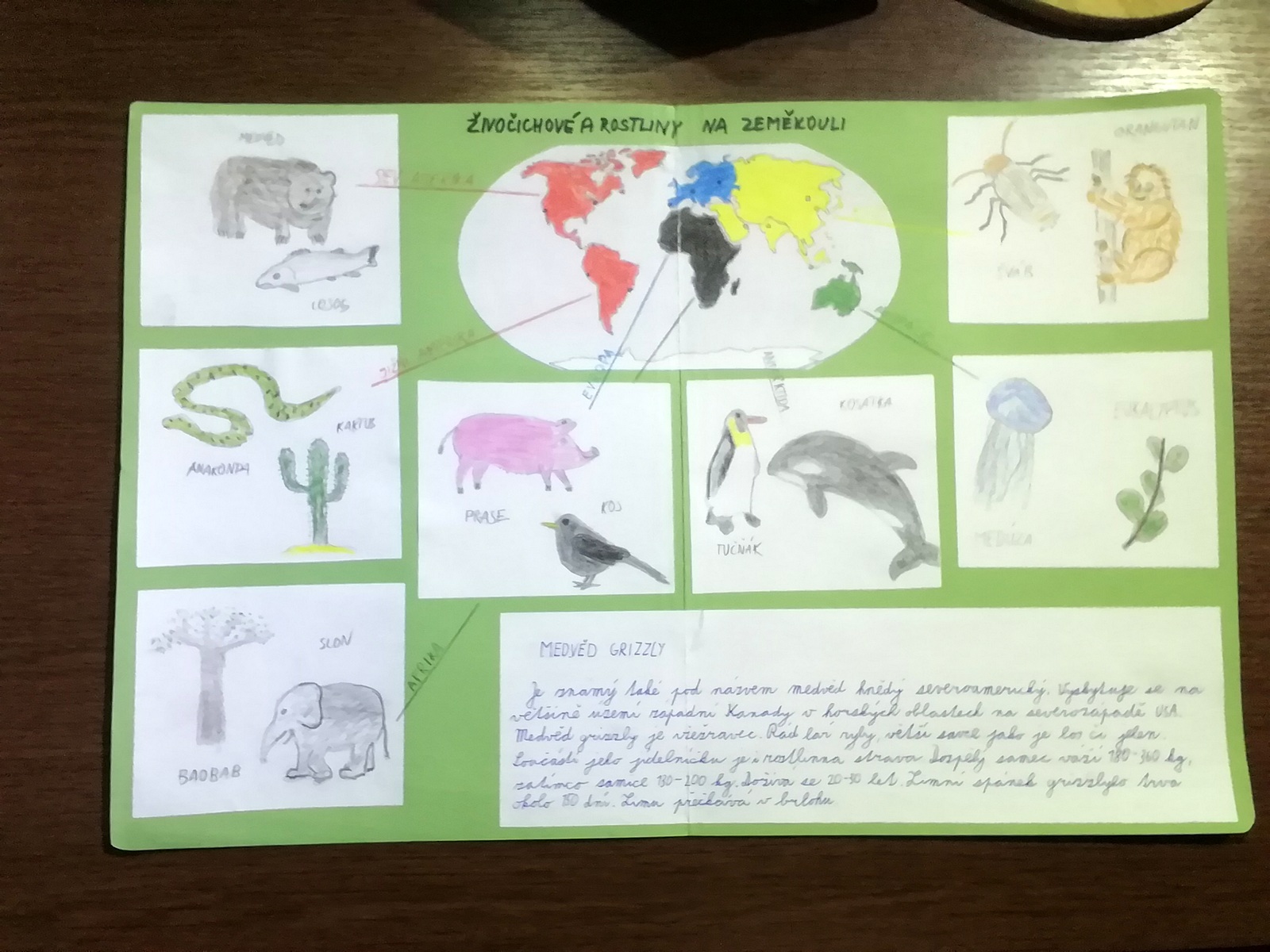 V rámci mezipředmětového propojení žáci 5.C pracovali během distanční výuky na projektu z přírodovědy. Úkolem bylo zakreslit všechny kontinenty, jak jsou rozloženy na Zemi. Do každého kontinentu měli nakreslit 2 zástupce živočichů nebo rostlin typických pro daný kontinent. Jak se jim to povedlo, posuďte sami.