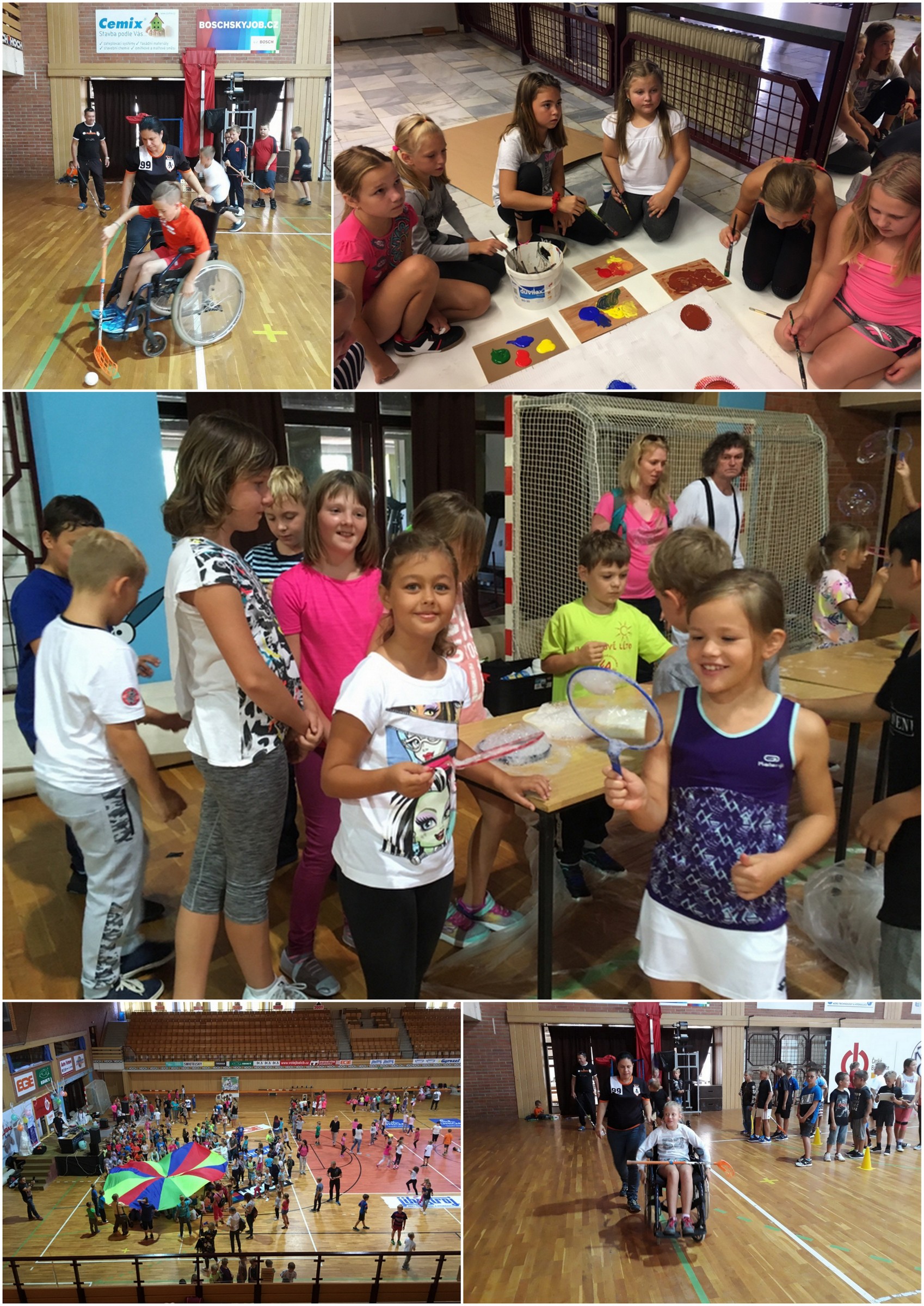 Ve čtvrtek 5. září se žáci ze 4. B a 4. D vydali na setkání zdravých a handicapovaných dětí do budějovické sportovní haly. Na místě se sešlo několik stovek dětí z různých českobudějovických škol, aby si společně užily dopoledne plné her a soutěží. Mohly si vyzkoušet jaké je to hrát florbal na vozíku, poslepu shazovat předměty „mečem“, pohrát si s psychoterapeutickým padákem, vyfouknout obří bubliny nebo si zatančit. Nejoblíbenějším stanovištěm byla virtuální realita. Během dopoledne pořadatelé vyhlásili několik soutěží. V jedné z nich dostaly děti za úkol naučit se větu ve znakovém jazyce. I naše škola měla v soutěži svého zástupce, který úkol zvládl na výbornou. Ani ostatní se znakové řeči nezalekli a naučili se celou větu znakovat během cesty zpět do školy.