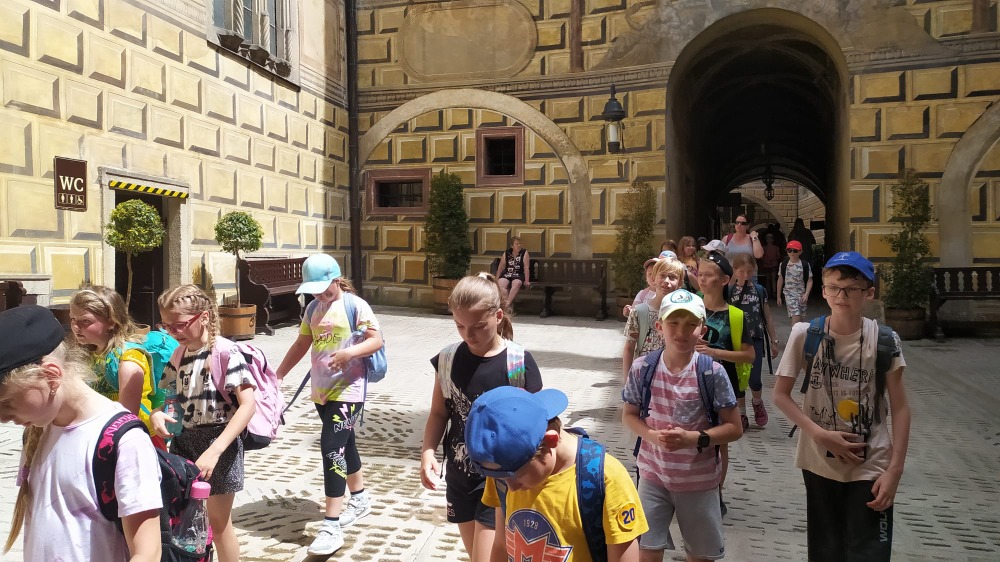Ale ani na prohlídku historického centra města žáci nezapomněli. Prošli si centrum města, prohlédli si krumlovské náměstí, zámek i hrad zvenčí. Viděli různé atrakce ve městě, nad městem na laně vrávorající akrobaty, krumlovské medvědy i vodáky plující po Vltavě.