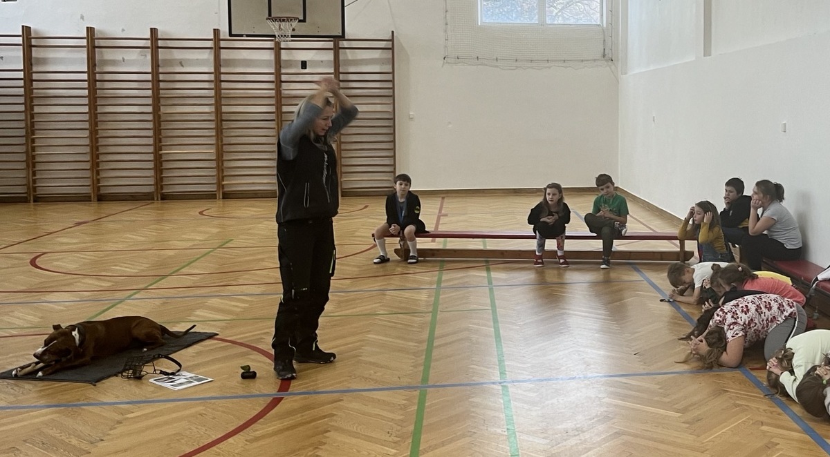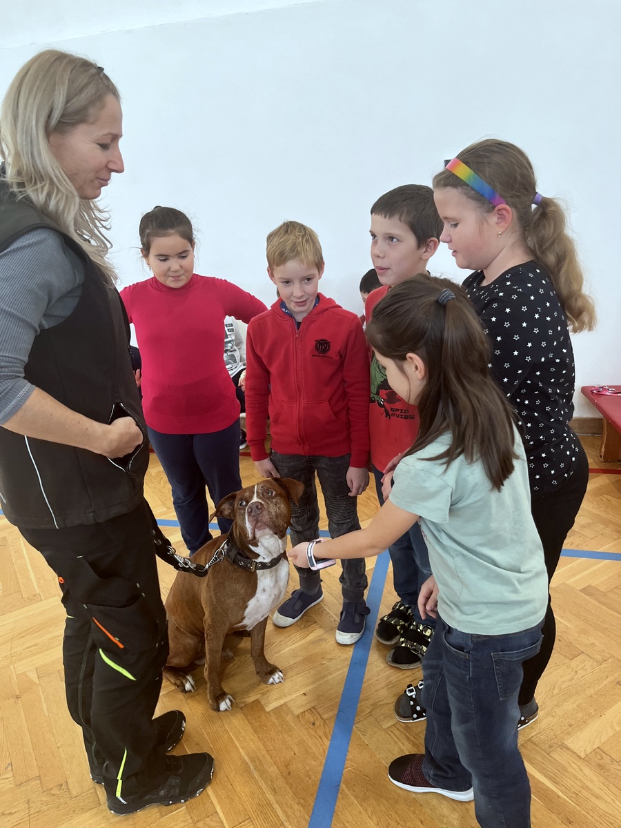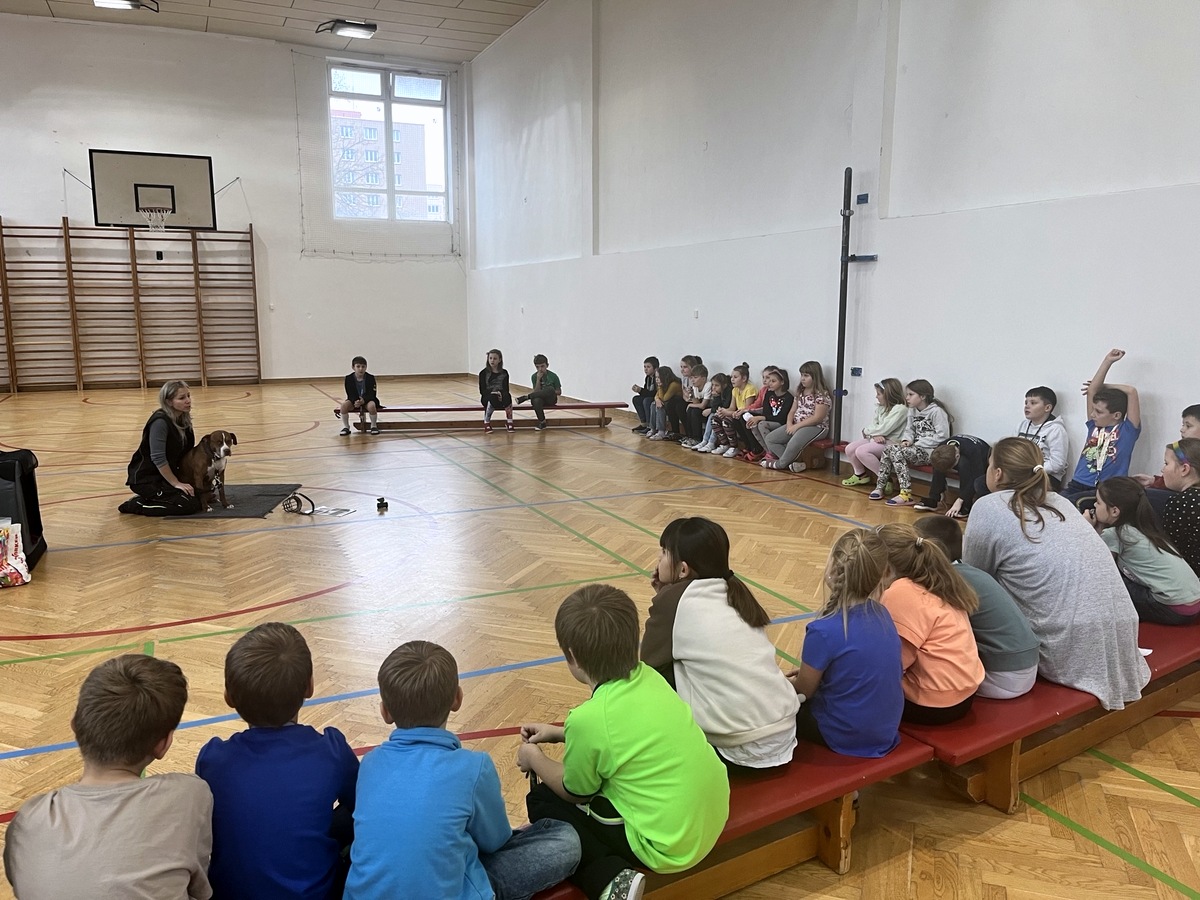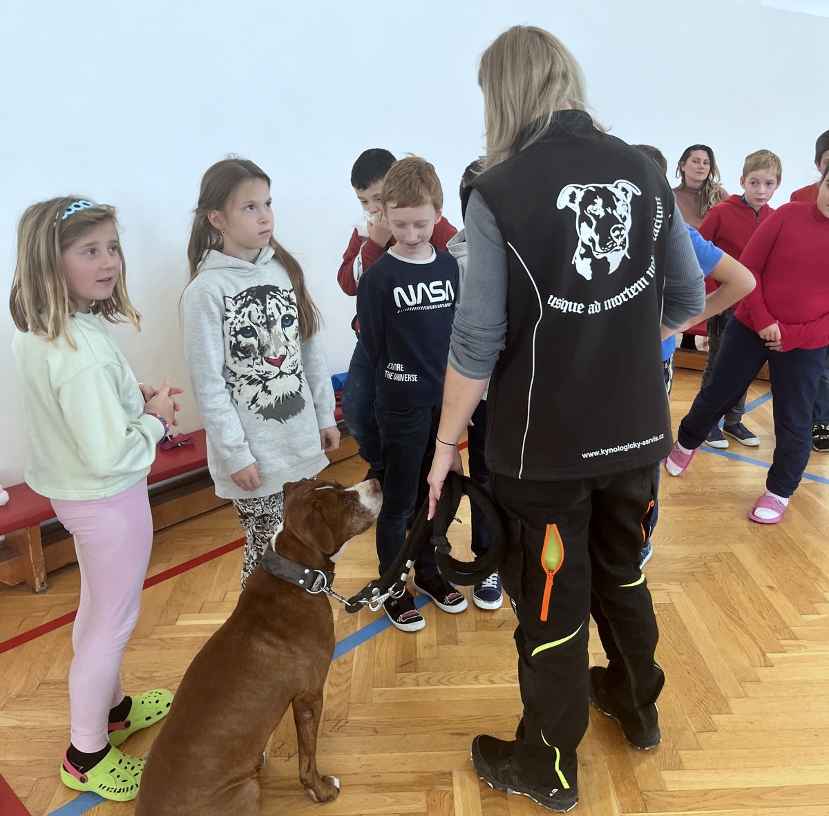 V první části se žáci seznámili s pejskem, který za námi přijel. Naučili se znát řeč psího těla, jeho mimiku a rozpoznat varovné psí signály. V další části si navodili konkrétní situace ze života, do kterých se mohou žáci spolu s cizím psem venku dostat a jak tyto situace řešit a co v těchto případech nejlépe dělat. Žáci si osvojili techniky, které jim pomohou chránit důležité části těla v případě útoku psa.