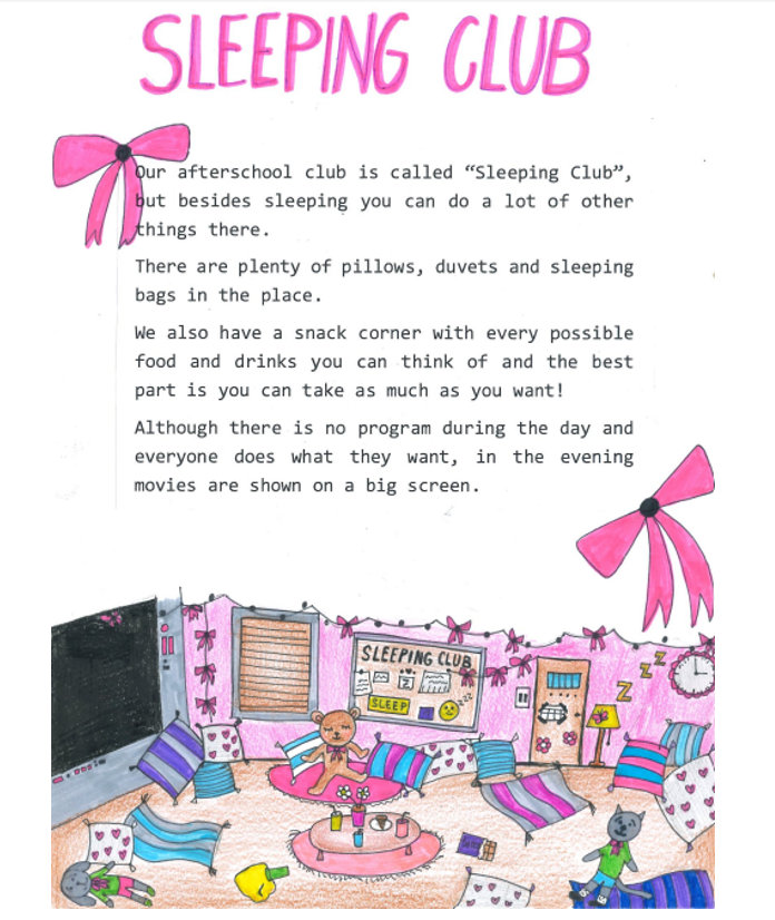 Žáci ze tříd 7. A a 8. B se zapojili do celosvětové soutěže Project Competition 2024: Your dream after-school club vyhlášené nakladatelstvím Oxford University Press. Úkolem bylo vytvořit plakát, na kterém bude nakreslen prostor, kde žáci tráví čas po škole, a popsáno, jakým aktivitám se zde věnují, kdy se scházejí, co se naučí, čím je jejich kroužek speciální. Žáci uplatnili svou nápaditost a za účast všichni obdrželi diplom.