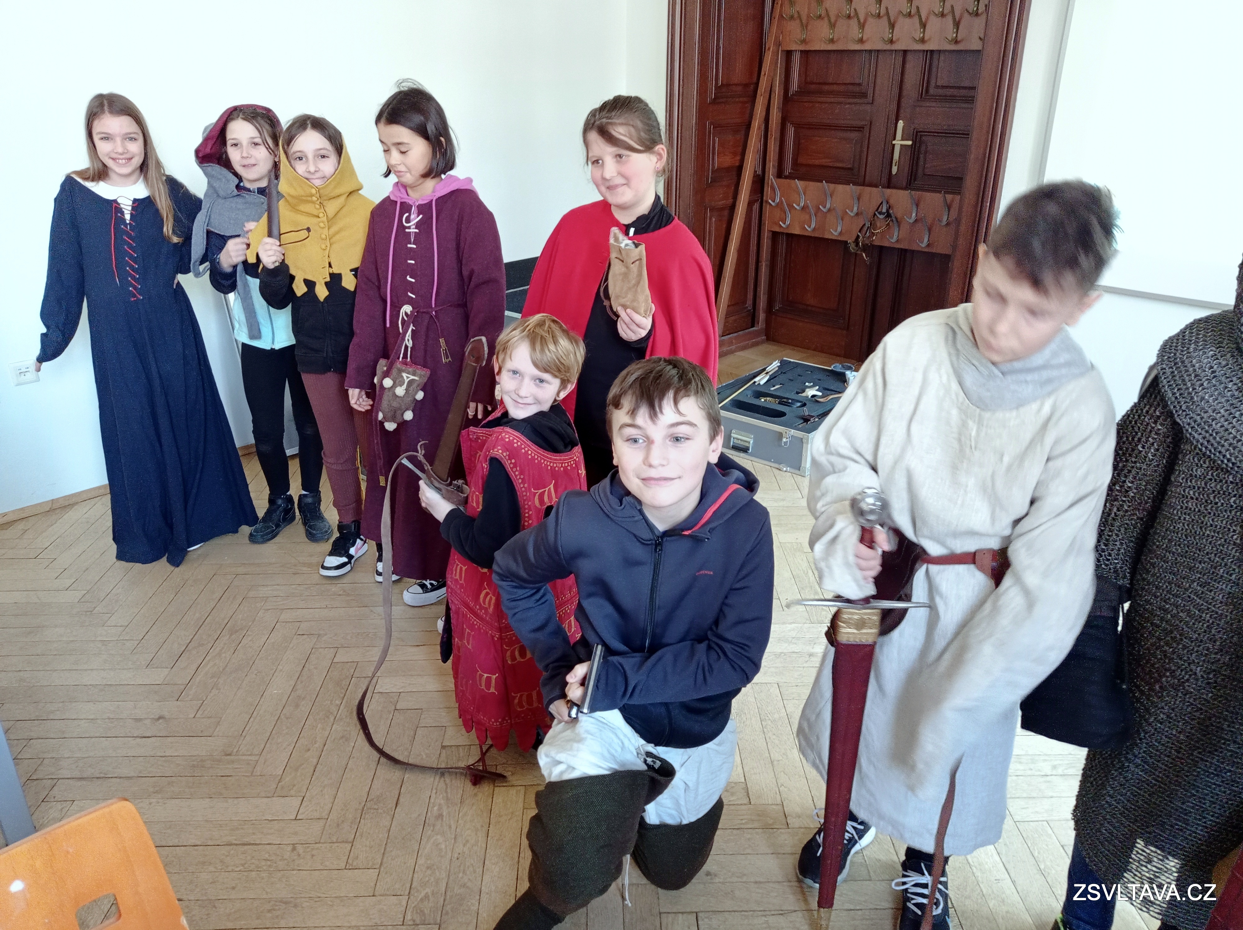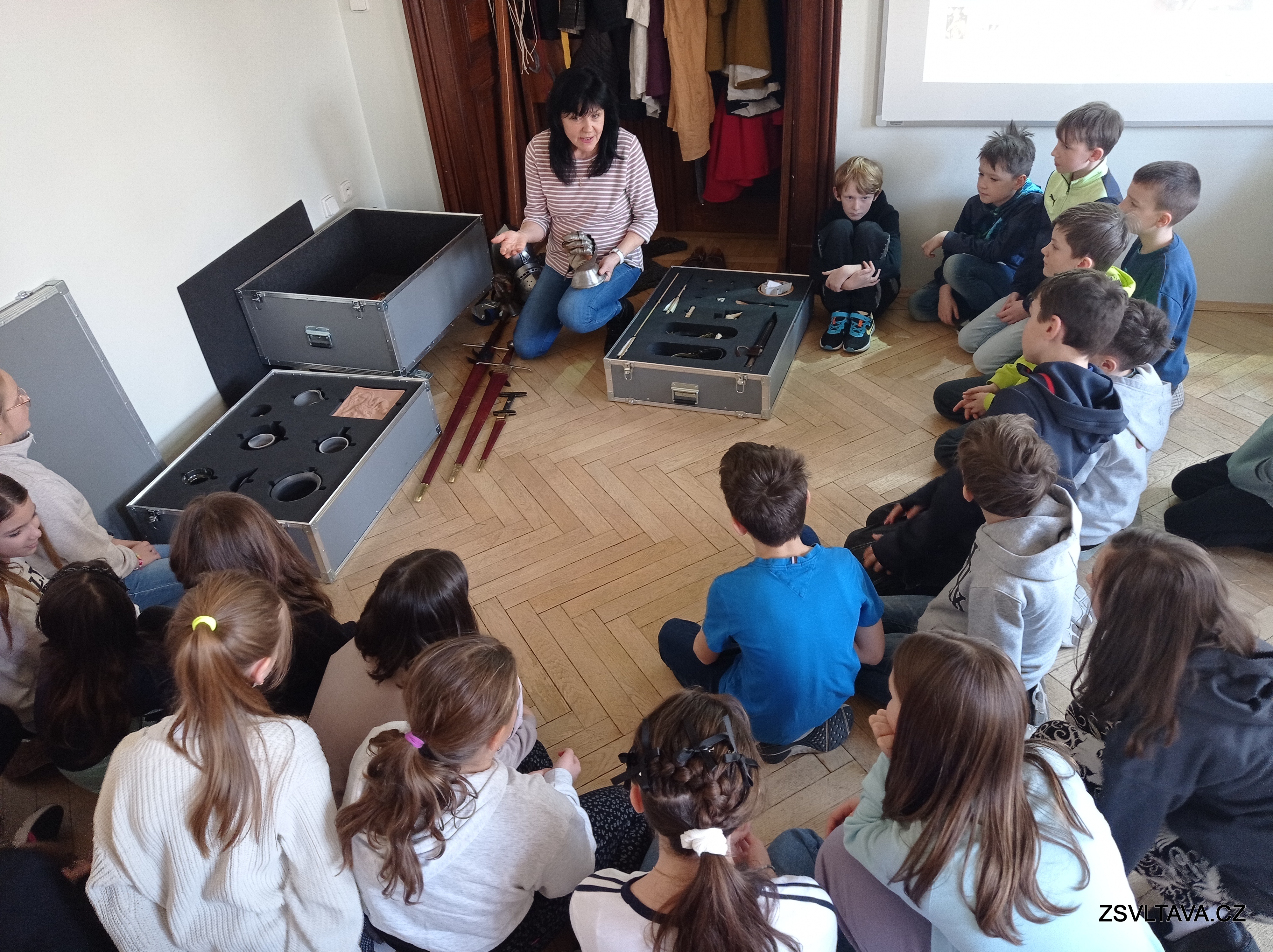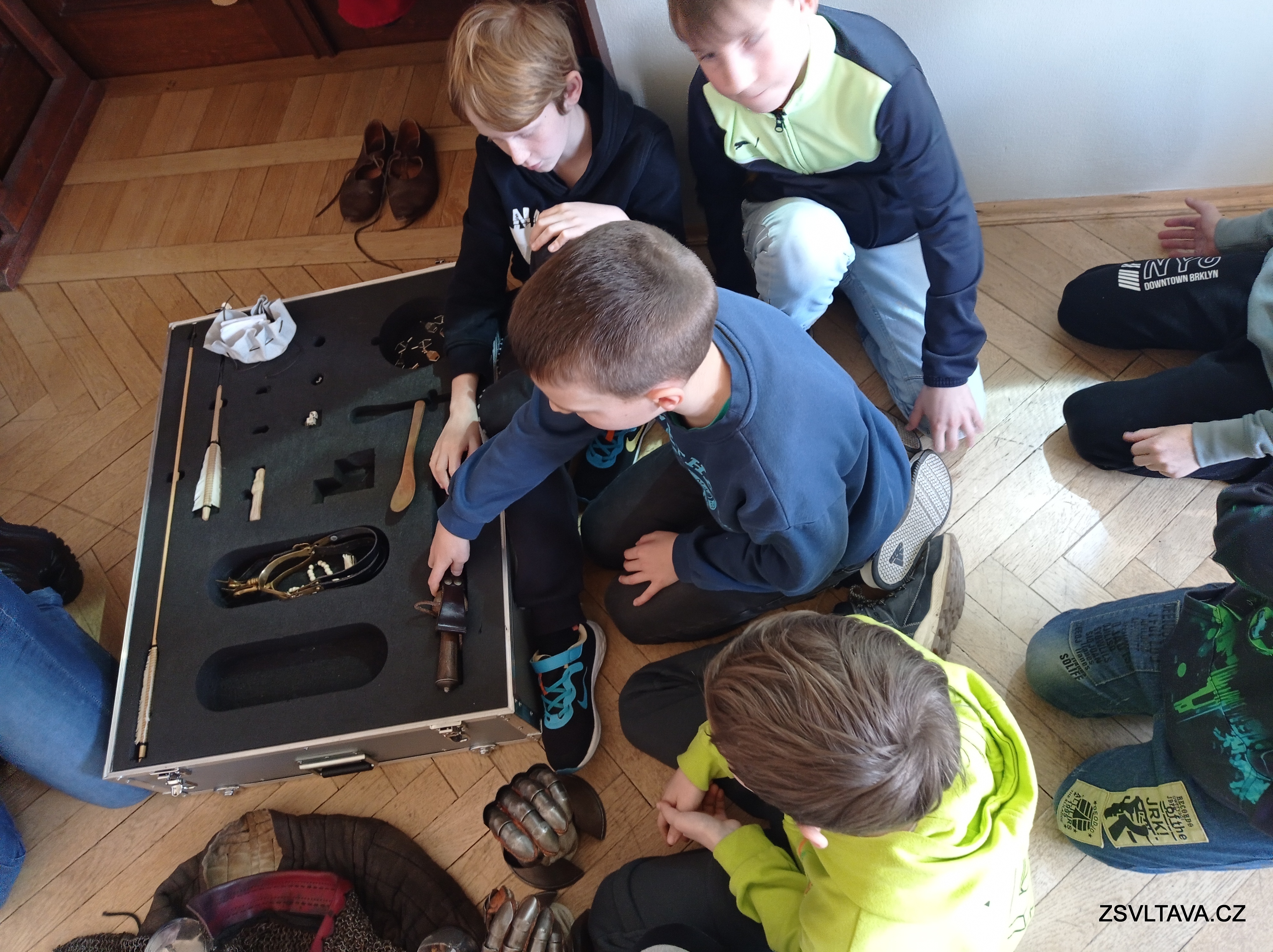 Dále měli možnost nahlédnout do muzejního kufříku. Prohlédli si předměty a ošacení, které bylo typické pro 14.-15. století. Kromě těchto věcí v kufříku žáci nalezli i zbraně jako je kuš, luk a šípy, píšťala. Bylo jim vysvětleno, jak se zbraně používaly. Část kufříku byla věnována i tématu dětí ve středověku. V kufříku žáci nalezli dětské hračky – keramickou panenku, koníka a také hru cvrnkání kuliček. Dále i předměty související s volným časem ve středověku a zábavou – kostěné hrací kostky a desková hra mlýn.