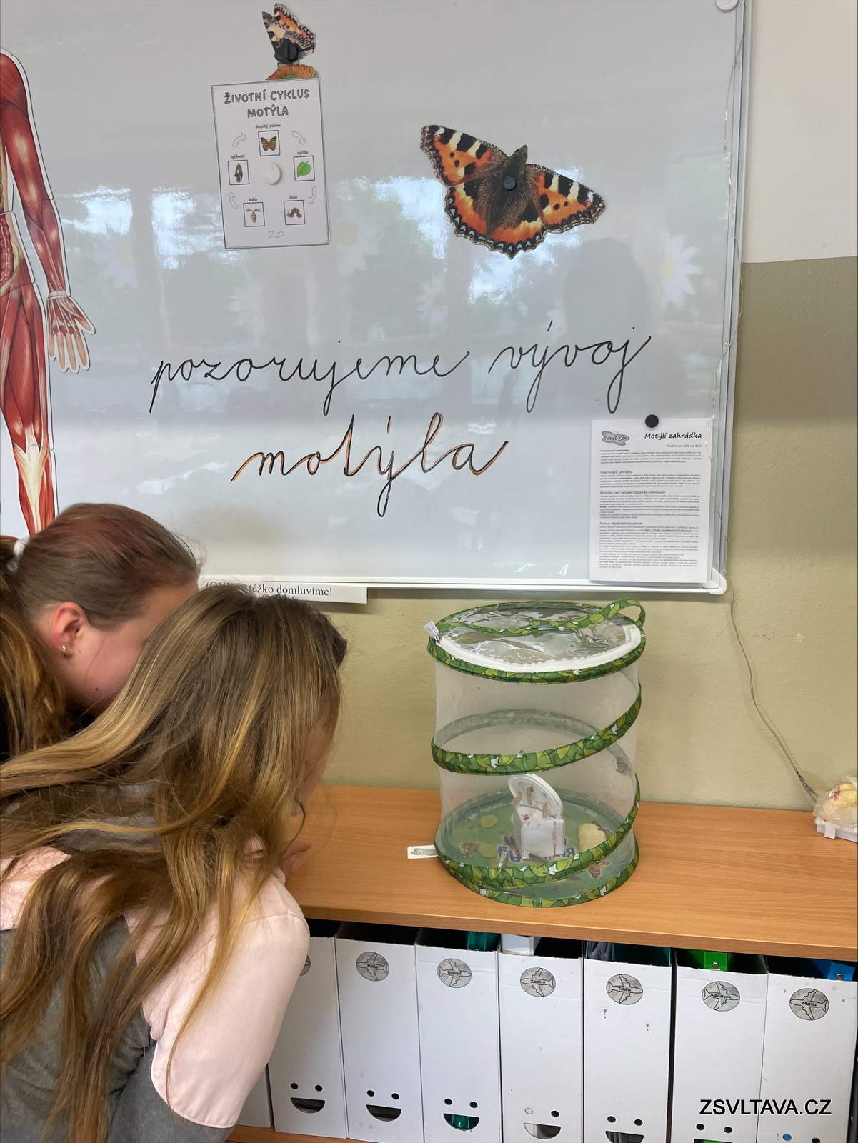 Na začátku května jsme se v 5.D pustili do projektu chovu motýlů a sledování jejich vývoje, a to od stádia housenky až po dospělého motýla, konkrétně babočky kopřivové.