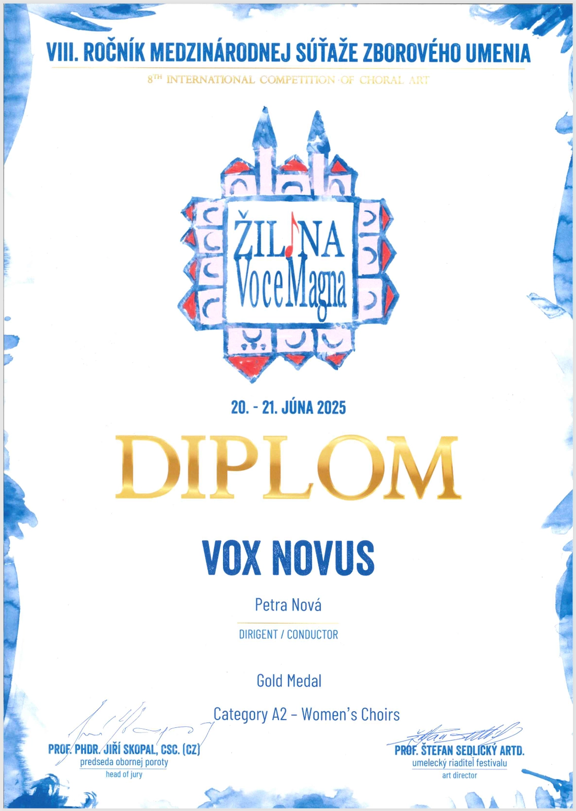 Ženský sbor Vox Novus se od 20.-22. června 2025 zúčastnil mezinárodního soutěžního sborového festivalu ve slovenské Žilině. V pátek se předvedl ještě s mládežnickým sborem Ondrášek a Žilinským smíšeným sborem na zahajovacím koncertu v kostele Obrácení sv. Pavla. V sobotní soutěžní části festivalu byl výkonu sboru oceněn mezinárodní porotou zlatým pásmem. Děkujeme za podporu zřizovatelské škole ZŠ a ZUŠ Bezdrevská 3 a za finanční podporu Městu České Budějovice.