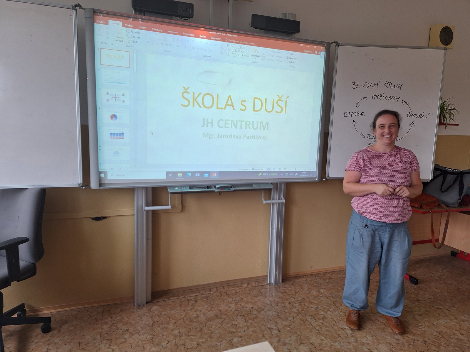 Vzhledem k tomu, že si v současné době lidé čím dál více uvědomují, že péče o psychické zdraví je nesmírně důležitá, rozhodla se část našeho pedagogického sboru 2. stupně zúčastnit vzdělávacího interaktivního programu "NENÍ DUŠE JAKO DUŠE" - ŠKOLA S DUŠÍ. Program byl zacílen nejen na péči o žáky, ale i o nás, učitele. Získali jsme základní informace o nejčastějších duševních onemocněních a zároveň rady, jak jim předcházet. Také jsme se dozvěděli, kde hledat odbornou pomoc, když začínáme mít pocit, že na celou situaci už sami nestačíme, jak rozeznat první signály toho, že problém s duší (jak dětskou, tak tou naší) může být už na cestě. A to nejdůležitější, jak o naši duši pečovat. Programem nás provedla skvělá paní lektorka Jaroslava Paštiková, která se věnuje práci s klienty v JH centru (terapeutické a vzdělávací centrum pro děti a dospělé) a zároveň pracuje jako sociální pracovník a vedoucí týmu v organizaci FOKUS Tábor, z.s. (organizace věnující se lidem s vážným duševním onemocněním). Za inspirativní a příjemně strávený čas paní lektorce děkujeme!