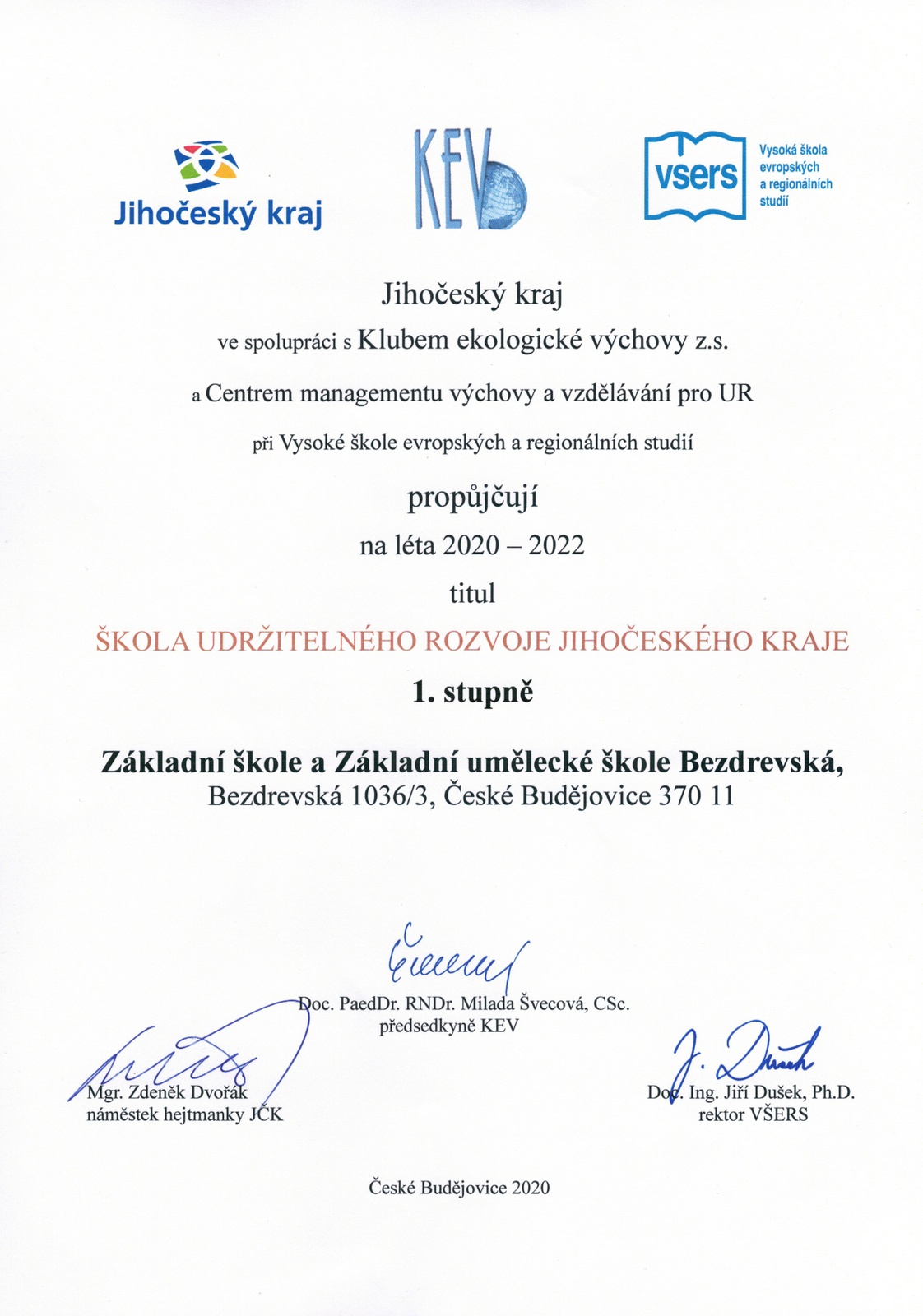 V naší škole se tyto principy snažíme realizovat prostřednictvím projektu Ekoškola a v současnosti především využíváním školní Přírodní zahrady. Žáci navrhují a poté uskutečňují změny tak, aby byla zajímavým místem pro výuku, odpočinek a zároveň poskytovala místo pro život mnoha rostlinným i živočišným druhům. Na základě těchto aktivit byl škole propůjčen titul Škola udržitelného rozvoje Jihočeského kraje.