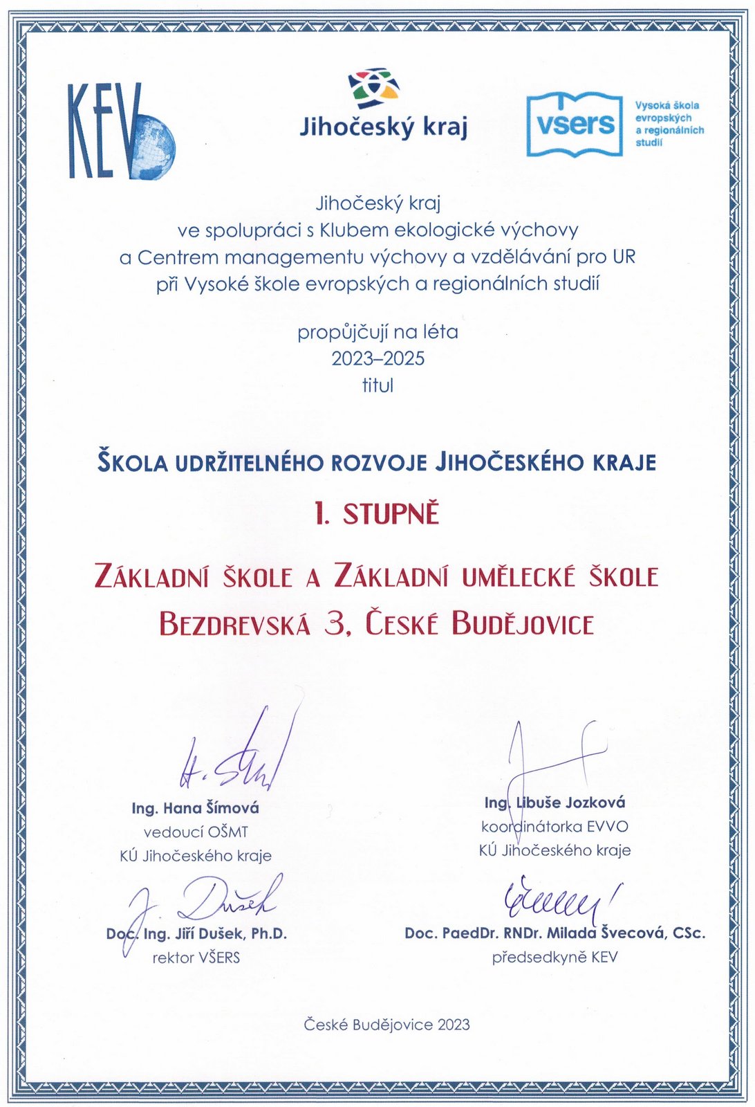 Tento titul by naší škole přiznán za aktivity, které vedou k vytváření harmonických vztahů mezi člověkem a přírodou a předpokladů trvale udržitelného života pro budoucí generace. Proto se naši žáci zapojují do ekologických projektů, starají se o školní zahradu a prostředí školy.