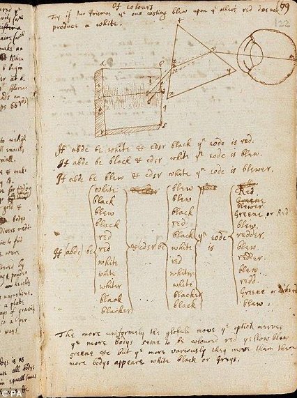 O svém pozorování a nápadech si vedl deníky. Zde je stránka, ve které zapisuje poznatky z optiky.